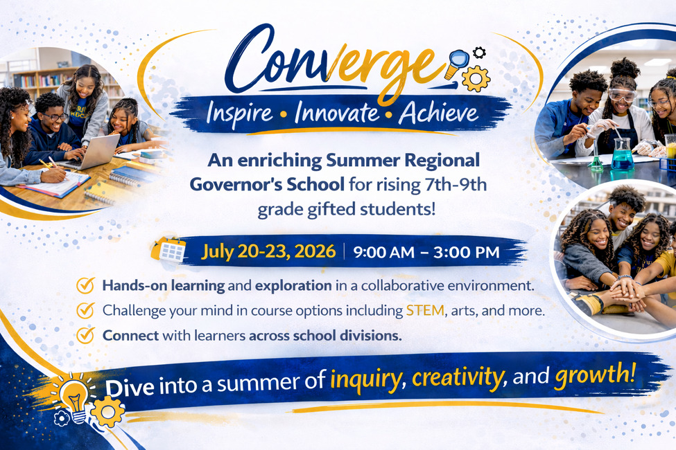Converge Summer Regional Governor’s School invites curious learners to experience a robust educational environment. Converge serves rising 7th-9th grade identified gifted learners from participating Region 1 school divisions. The program creates a collaborative space where inquiry is celebrated and academic passions are ignited. Students engage in the areas in which our region offers gifted programming, including General Intellectual Aptitude (GIA), Specific Academic Aptitude (SAA), Visual and Performing Arts (VPA), and Career and Technical Education (CTE), fostering both depth and breadth of learning.